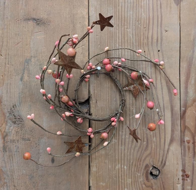 These candle rings have large and small pip berries, and rusty stars on a 2.5 inch inner diameter candle ring. All berries and rusty stars are on wire for easy shaping