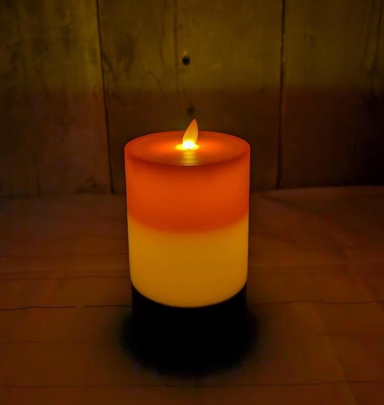This flameless candle requires three AAA batteries (not included). It has an on off switch and option for a 6 hour timer. It measures 6 inches tall and 3.5 inches wide and has a realistic moving "flame".
